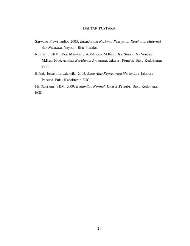 DAFTAR PUSTAKA Adriaansz Wiknjosastro dan Waspodo 2007 Buku Acuan Nasional Pelayanan Kesehatan Maternal dan NeonatalJakarta Yayasan Bina Pustaka.